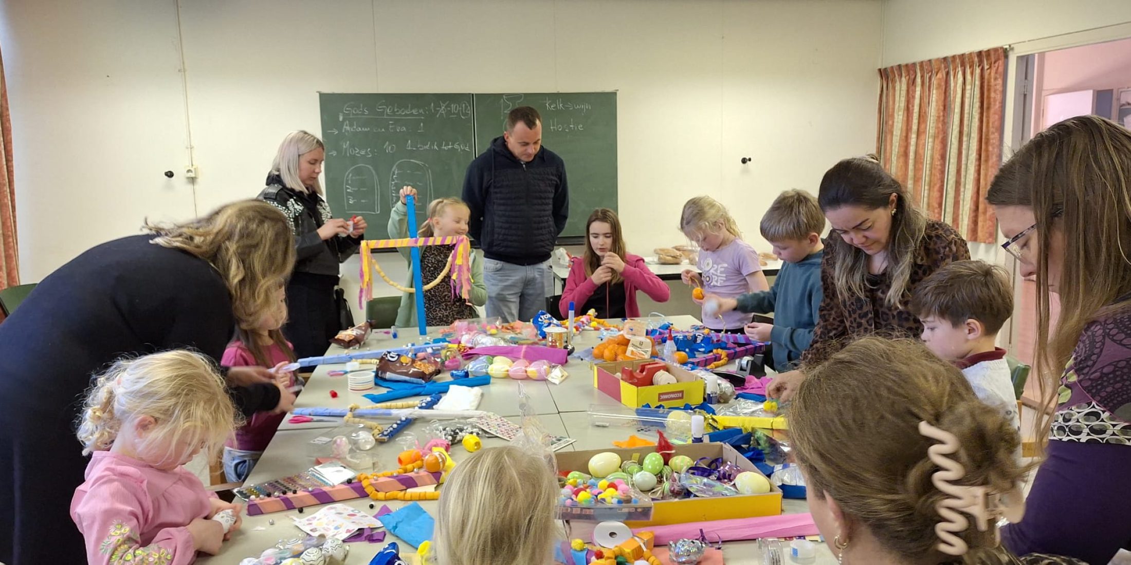 Afgelopen weekend vierden we samen het familiepastoraat rondom Palmpasen. Op zaterdag gingen de kinderen enthousiast aan de slag met het maken van Palmpasenstokken. We begonnen met het voorlezen van het verhaal van Palmpasen en gaven uitleg over de betekenis van alle onderdelen van de stokken. Daarna oefenden we in de kerk voor de gezinsviering van zondag. Als feestelijke afsluiting van de middag was er nog een leuke verrassing: eieren zoeken in de tuin van de pastorie.